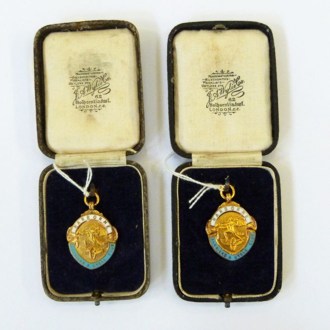 Two enamelled 9ct gold cycling medals, each featuring a central winged figure over a winged bicycle wheel and inscribed 'Harbourne Harriers and Cycle Club', inscribed to reverse and dated 1929 and 1931, total weight approx. 20.2g
