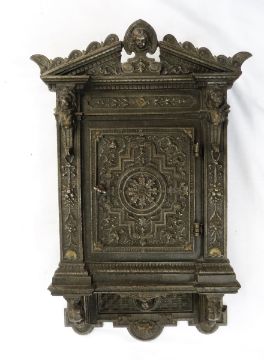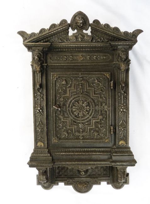 Victorian cast iron & wood key cabinet with mask and scroll triangular pediment, ornate strapwork and decoration to the door, animal masks, approx. 47cm high.