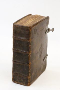 'Holy Bible - printed at London by Robert Barker 1647', engraved title page with vignette of London, bound with 'the Whole Book of Psalms collected into English' by Thomas Sternhold, John Hopkins and others, London printed by R Bishop 1647, various ink inscriptions on ep, contemporary leather binding, blindstamped with metal hasps, one strap missing