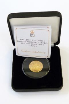 Jubilee Mint Queen Elizabeth II 'Longest Reigning Monarch' 22ct gold proof £1 coin, 22mm diameter and weighing 8g, in original box with certificate