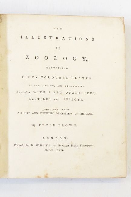 Brown, Peter "New Illustrations of Zoology, containing fifty coloured plates of new, curious and non-descript birds with a few Quadrupeds, Reptiles and Insects ...", London, B White 1776, there is also a title page in French, text in English and French, plate 36 has a tear but no damage to the coloured engraving and page 69 has been repaired at the hinge, contemporary marbled bds, half-leather with gilt titles and decs with raised bands to the backstrip, aeg