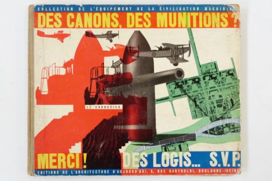 Jeanneret , Pierre " Des Canons, Des Munitions ?, Merci! Des Logis...SVP" oblong 4to. p148, ills. black and white photographs, some part col. Original boards with photo montage, hinges weak, corners bumped. First edition of Le Corbusier's demand for investment in housing rather than armaments....
