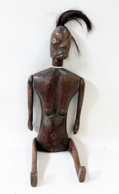 Carved hardwood articulated tribal figure, possibility an Indonesian fertility doll, the female figure with inlaid bone eyes and hair, 36cm long (2 boxes)