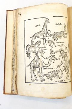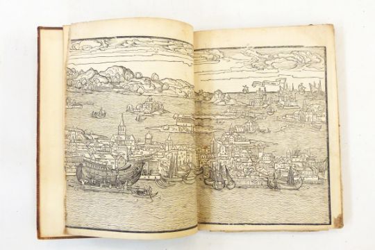[Breydenbach, Bernhard von]"Peregrinatio in Terram Sanctam", the woodcut ills are drawn by Erhard Reuwich, (first published in 1486), large folding woodcut plate of Jerusalem with some reparation, folding plates of other cities, woodcut of various animals, staining, text in Latin, final page with worm damage and some repair, tooled full calf with raised bands, gilt titles and pastedown, date 1502, to the spine, ink inscription of ffep, also a letter has been tipped in to ffep