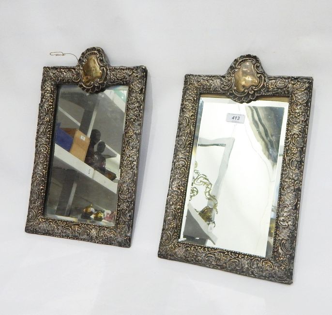 LOT WITHDRAWN Pair of Edwardian silver photograph frames, each rectangular and with vacant shield-shaped cartouche surmounting, the frames embossed with rococo scrolls, flower heads and trelliswork, Chester 1901, 41cm x 25cm