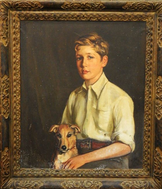Unattributed (early 20th century school) Oil on canvas Half-length portrait of a young boy holding a dog, unsigned, 74.5cm x 62cm (tear to canvas)
