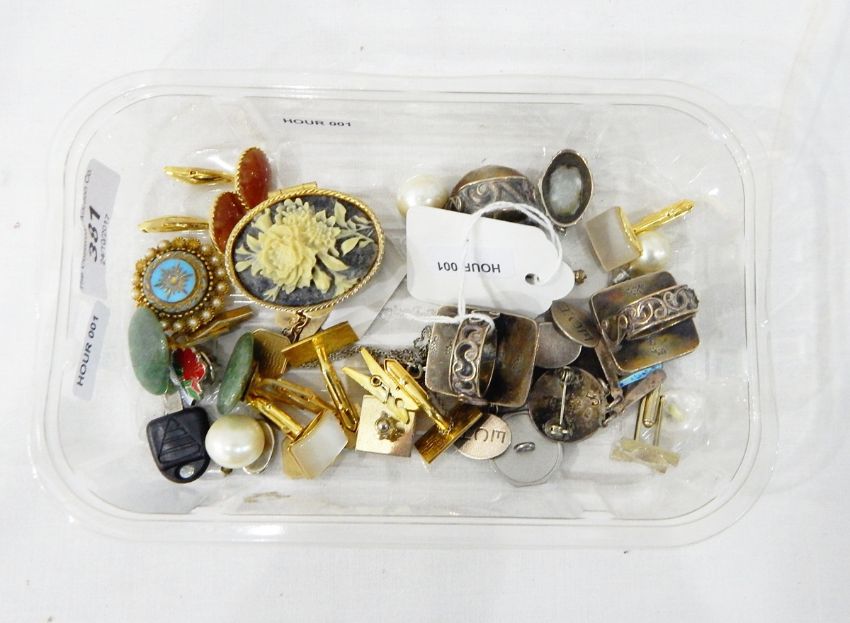 Mexican 925 standard ring of rectangular form, set with a central amethyst, with wirework decoration and a border of small turquoise cabochons, another similar ring set with turquoise, also marked 'Mexico 925', another similar unmarked example of circular design, a Mexican 925 standard enamel brooch marked with monogram 'JF', a pair of silver cufflinks of engine-turned design and various other items