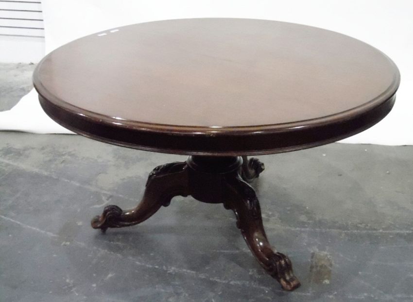 Victorian mahogany circular tilt-top breakfast table on turned octagonal pedestal, carved tripod supports, scroll toes and brass castors, 132cm diameter (together with separate MDF for extending)
