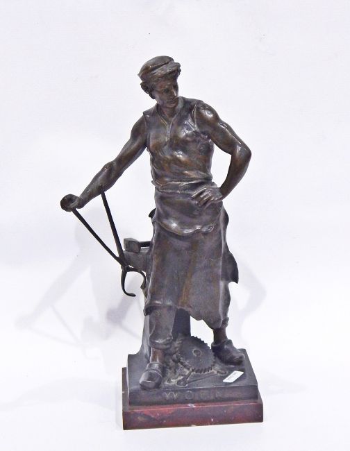 After Emile Louis Picault spelter figure "Work", depicting a blacksmith, the base titled and with signature, on variegated marble plinth, 35cm high