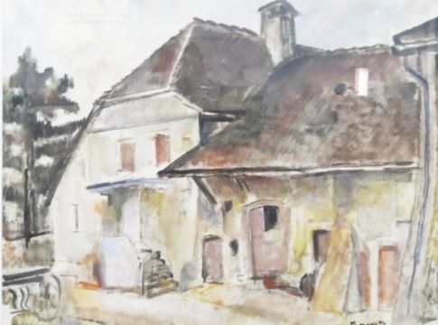 Quantity of pictures and prints including colour print of French farmhouse, watercolour drawing, small watercolour landscape scene entitled in pencil "Cotswolds Near Broadway", etc.