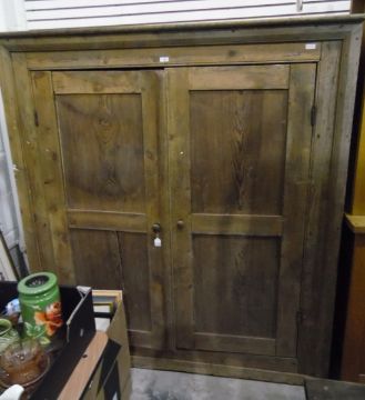 19th century pine kitchen cupboard, the pair of panelled doors enclosing shelves, raised on a plinth base, width 154cm