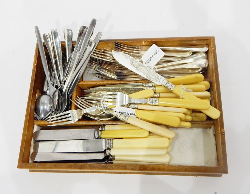 Set of Edwardian fish knives and forks with engraved silver plated blades and silver collars and various other items of silver plated flatware