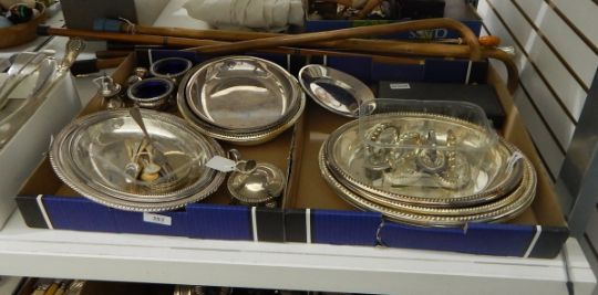 Quantity of silver plated entree dishes and covers, a silver plated five-piece condiment set comprising a pair of circular salts, a circular mustard and a pair of pepperettes, each with gadrooned borders, lion mask and paw feet and various other items of silver plate