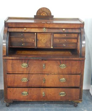 19th century Continental mahogany cylinder bureau, the roll-top revealing a fitted interior, over three long drawers, on castors, with later inlaid arched pediment 100cm wide
