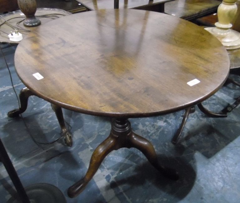 Early 19th century mahogany tilt-top breakfast table. the rectangular top over a turned stem on four splayed supports with brass caps and castors