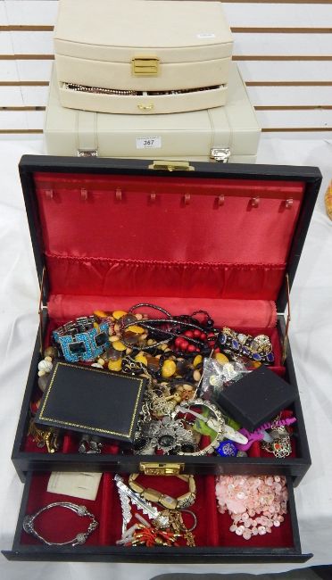 Modern hardstone necklace, the central carved flower suspended on a three row bead necklace, a quantity of simulated pearls, bead necklace, gilt metal serpent bangle, owl bangle, etc. (4 jewellery boxes in total)