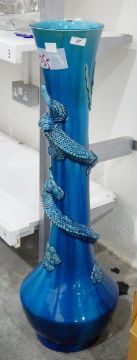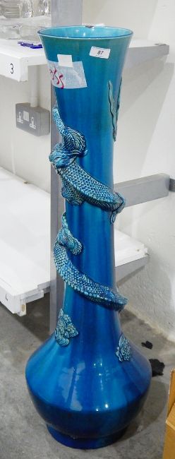 Modern large Oriental trumpet-shaped vase decorated with relief of dragon, 90cm high