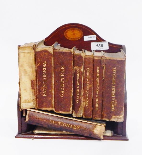 Early 20th century desk miniature reference library comprising eight volumes in inlaid mahogany stand
