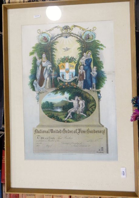 Framed print after Joseph Tilley, National United Order of Free Gardening, a framed print after Toulouse Lautrec, a naive painting on glass and various other framed and unframed prints and watercolours (9)