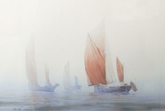 Bob McKay (20th century school) Watercolour Boats off the coastline, signed lower left, 35cm x 50cm