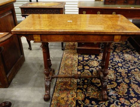 Victorian figured walnut veneered foldover card table on twin reeded standards, turned pole stretcher, on shaped supports with scroll toes, 82cm wide