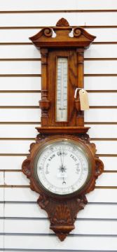Aneroid barometer and thermometer in carved oak case with floral decoration columns and swan neck pediment