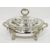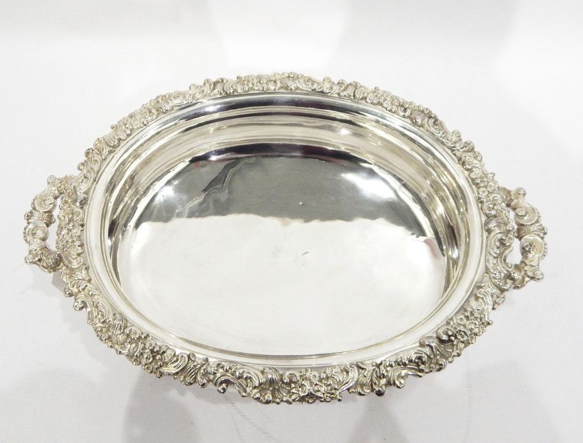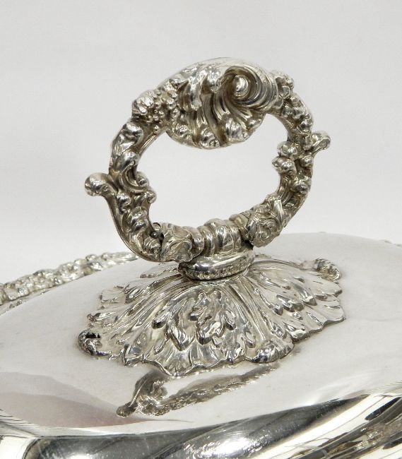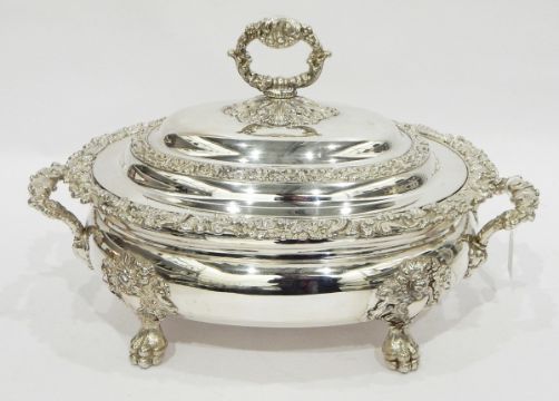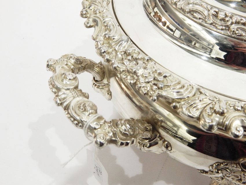 Victorian silver plate two-handled soup tureen, scroll relief decorated, on claw feet, un-hallmarked, 45cm wide x 25cm high approx., 151.2oz