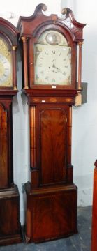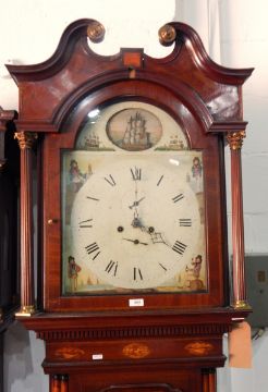 19th century inlaid mahogany longcase clock, with broken swan-neck pediment, painted Roman numeral dial, panelled trunk and box base, 230cm high approx.