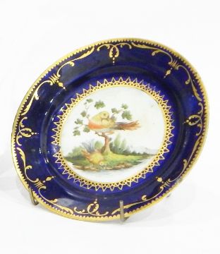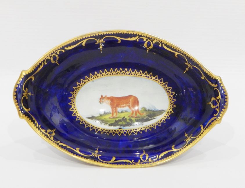 Late 18th century Coalport 'Animal' pattern two-handled urn (missing lid), with oval cartouche of fox, the blue ground with gilt decorations, an oval dish decorated with cartouche of lioness, the blue ground with gilt decoration and a circular dish decorated with exotic birds (3)