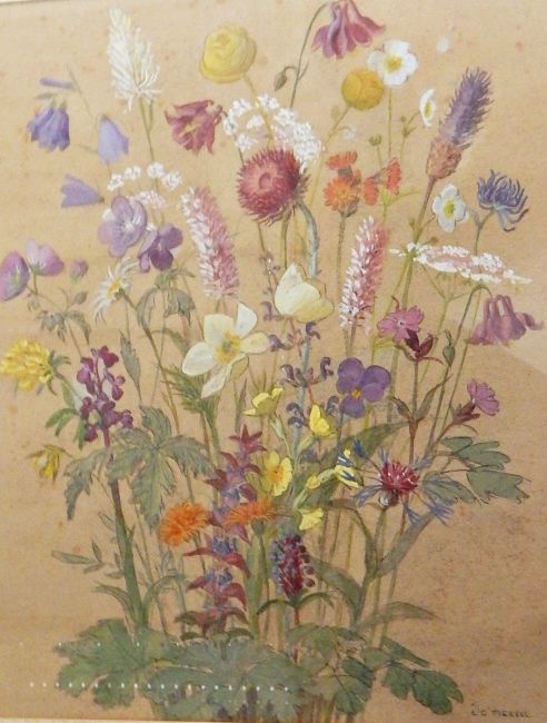L G Tickell (20th century school)Watercolour drawing Floral study, signed lower right, 43.5cm x 34cm, another still life watercolour, initialled 'AH' and a winter landscape watercolour, unsigned (3)