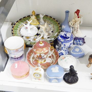 Cunard limited edition 'Queen Elizabeth II 1967-2008 by D John Wood' china vase, no.265/1000, a Golden Jubilee 2002 Buckingham Palace china coffee cup with saucer, three items of Wedgwood blue jasperware and other decorative items