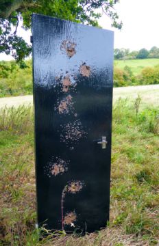 MADELEINE STAPLES  Redemption Fire door, gloss paint and gun holes Dimensions (hxlxd) 1965 x 775 x 140 mm (one door) Context: Standing alone, the door, painted black, is scarred with bullet holes. It stands like a shadow contrasting the domesticity of the artefact with aggressive wounds, it is both silent and violent at the same time. Its title Redemption suggests further that the work has been saved or that the brutality has offered saviour.