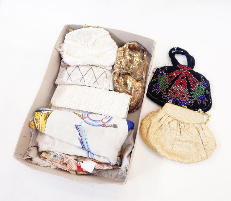 Quantity of beaded and other evening bags and two scarves (1 box)