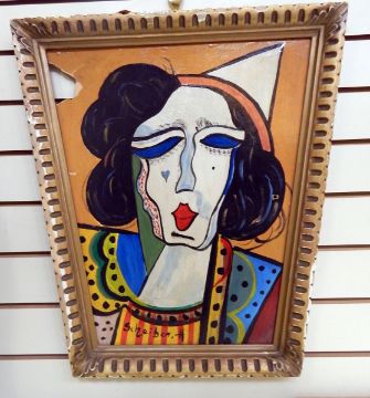 Attributed to Hugo Scheiber (Hungarian, 1873-1950) Gouache on card Head and shoulders portrait of a clown, signed lower left, 57cm x 41.5cm, in a tapering frame (damaged)