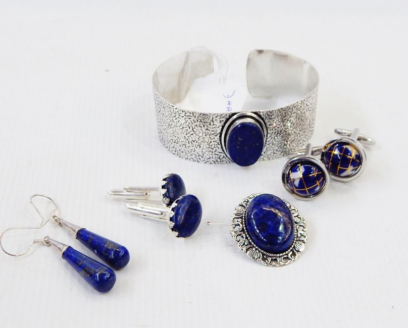 Silver-coloured metal and lapis lazuli mounted bracelet, earrings, brooch and two pairs of cufflinks