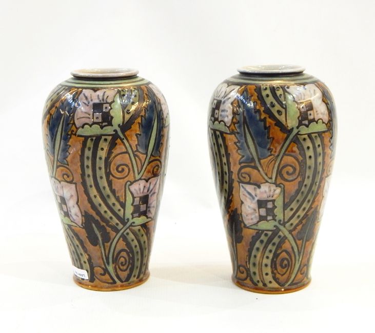 Pair of Royal Doulton stoneware vases decorated by Bessie Newbery, inverse baluster-shaped, stylised floral decorated, initialled 'BN' to base, number 694, 21cm high