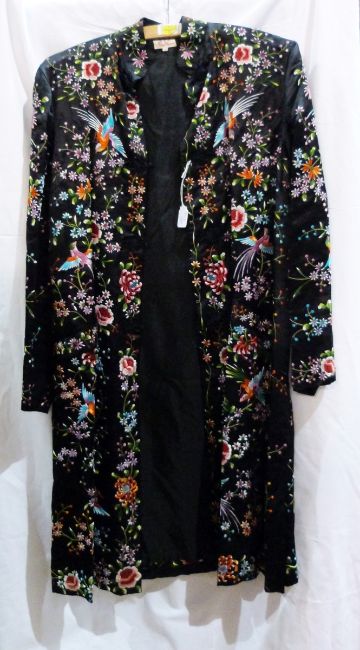 Chinese silk plum blossoms black silk coat, heavily embroidered with flowers, birds of paradise, etc.