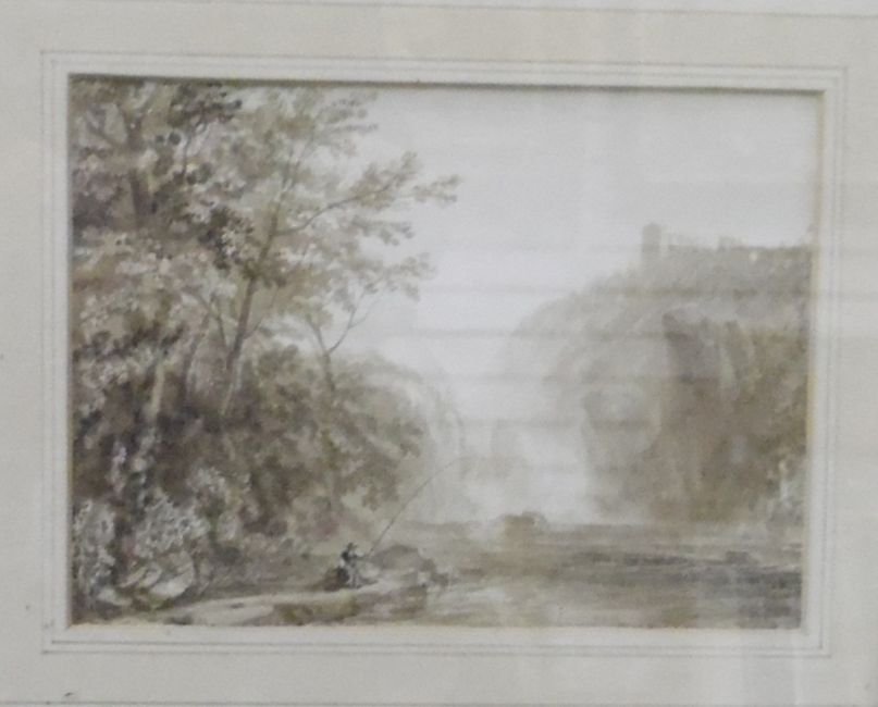 Attributed to Thomas Allom (1804-1872) Watercolour drawings Two fishing scenes and a couple walking in a country landscape, unsigned, 15cm x 20cm (3)