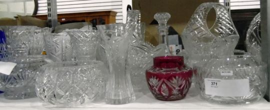 Large quantity of cut glass including bowls, vases, two flash glass items, a decanter, fruit baskets, etc.