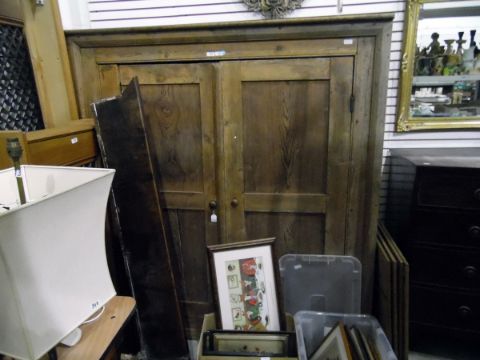 19th century pine kitchen cupboard, the pair of panelled doors enclosing shelves, raised on a plinth base, width 154cm