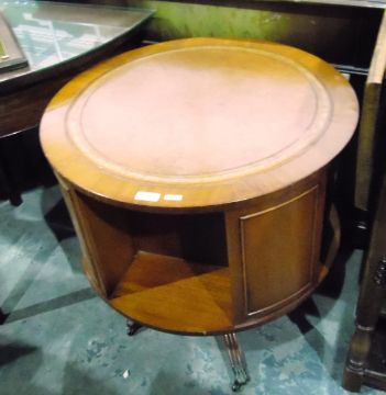20th century revolving drum-shaped table with inset writing surface and open shelves below, raised on a pedestal with reeded splayed legs and brass castors, diameter 61cm