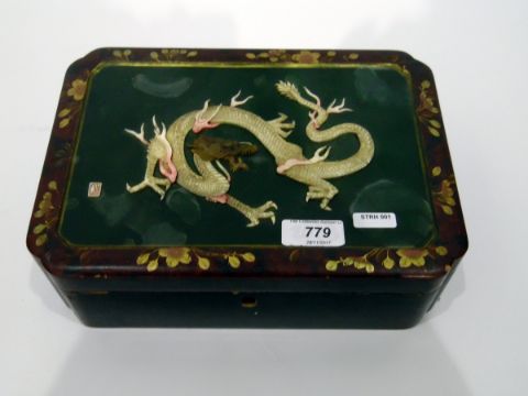 Japanese lacquered rectangular box with relief dragon to lid, 25.5cm x 18cm