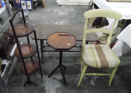 Three-tier mahogany folding cake stand, a wine table, a yellow painted Victorian standard chair and a veneered coffee/magazine table on lyre end supports (4)
