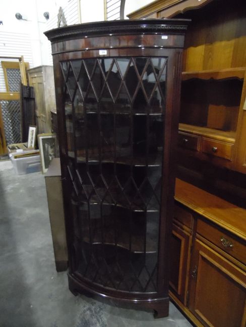 Georgian-style mahogany bowfront corner cupboard with carved Greek key cornice, the astragal-glazed door enclosing four shelves, bordered by fluted supports, raised on bracket feet, height 167cm