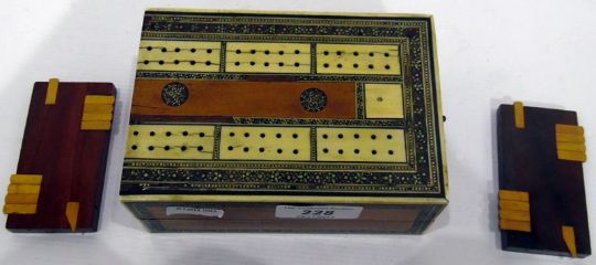 Middle Eastern inlaid travelling cribbage board and a pair of games markers (3)