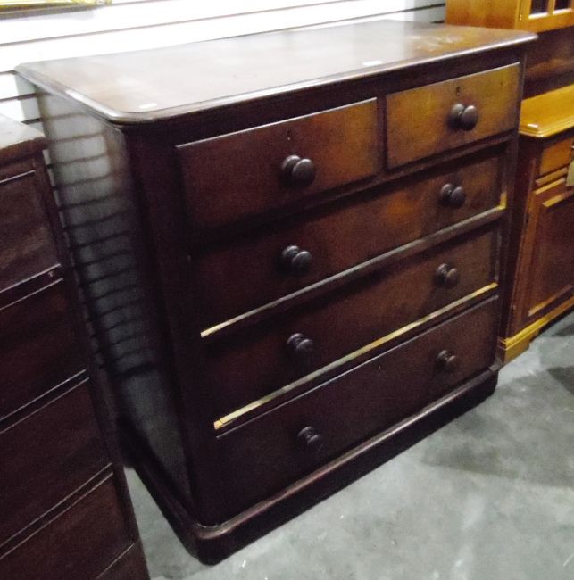 Victorian mahogany chest of drawers, the top with moulded edge, with two short and three long graduated drawers, with original turned and wooden knobs, raised on a plinth, width 1005cm