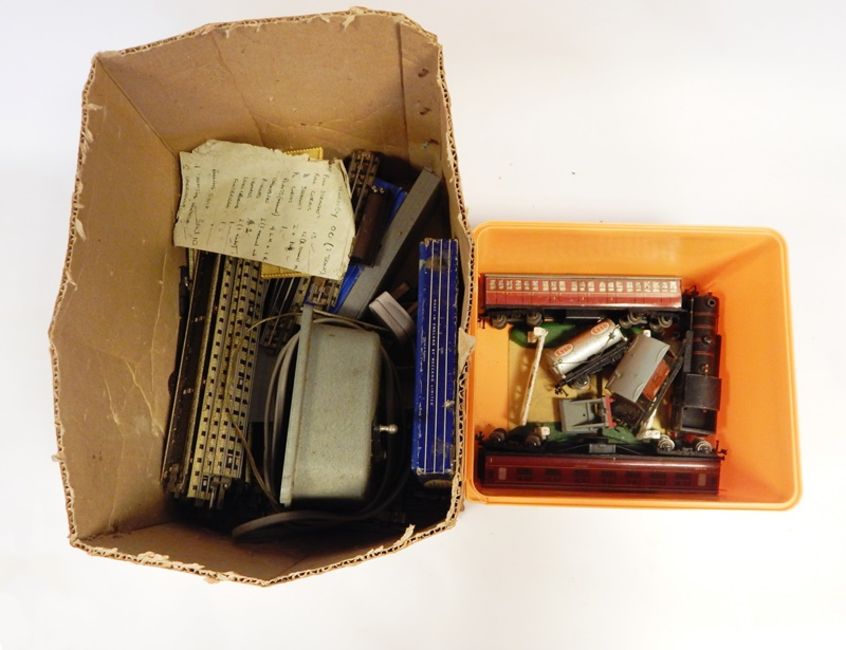 Hornby diecast loco 0-6-2, tinplate passenger carriages, coal wagon, diecast level crossing, buffers, quantity of track, boxed footbridge, etc. (2 boxes)