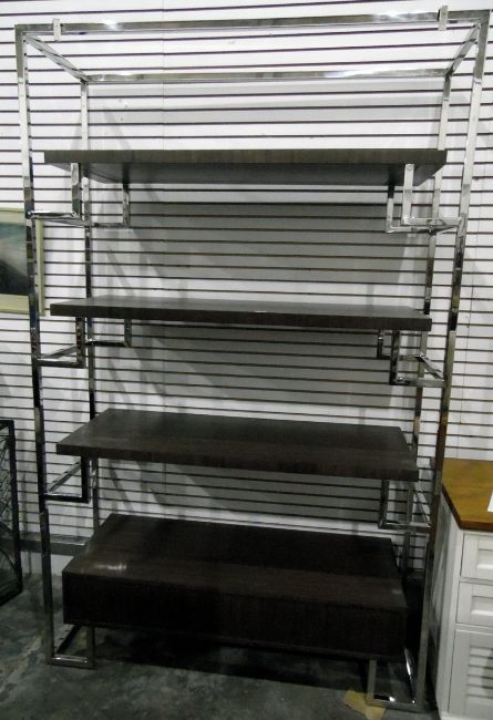 Set of modern walnut-veneered, four-tier display shelves with chrome supports