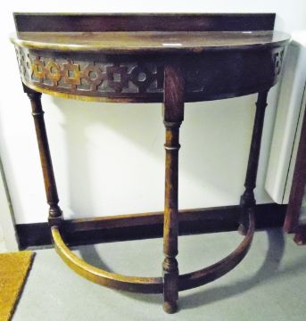 Early 20th century demi-lune hall/side table having carved frieze, on turned supports with bowed stretchers, 76cm wide