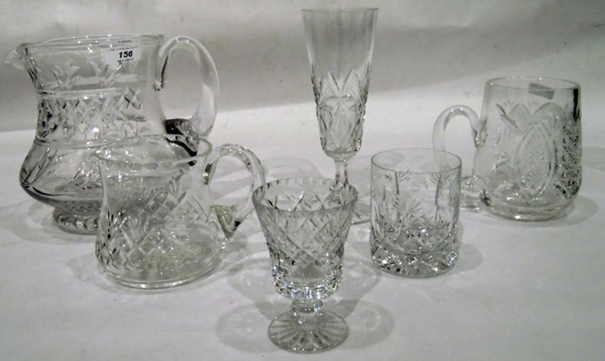 Two glass decanters, various glass jugs, four tumblers, champagnes and other glassware